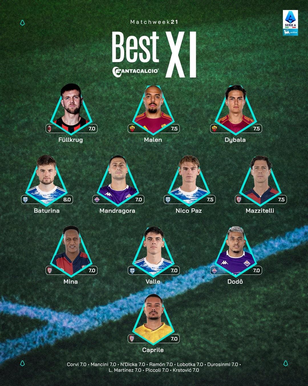 北京时间1月20日,意甲官方公布了联赛第21轮的最佳11人阵容,菲尔克鲁格、马伦、迪巴拉以及尼科-帕斯入选。意甲官方联赛第21轮最佳11人阵容:门将卡普里莱(卡利亚里)7.0分后卫多多(佛罗伦萨)7.0分、阿莱士-巴列(科莫)7.0分、米纳(卡利亚里)7.0分中场马齐泰利(卡利亚里)7.5分、尼科-帕斯(科莫)7.5分、曼德拉戈拉(卡佛罗伦萨)7.0分、巴图里纳(科莫)8.0分前锋迪巴拉(罗马)7.0分、马伦(罗马)7.5分、菲尔克鲁格(AC米兰)7.0分